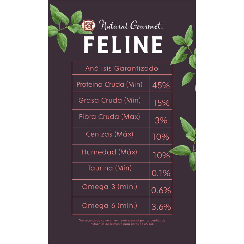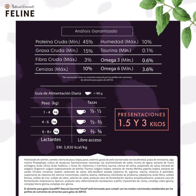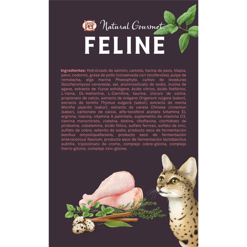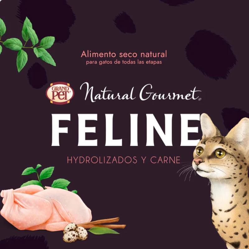 GrandPET Natural Gourmet Feline® es un alimento seco 100% natural, formulado con proteínas hidrolizadas y carne para una nutrición de alto valor, libre de granos, glute, colorantes y saborizantes artificiales.